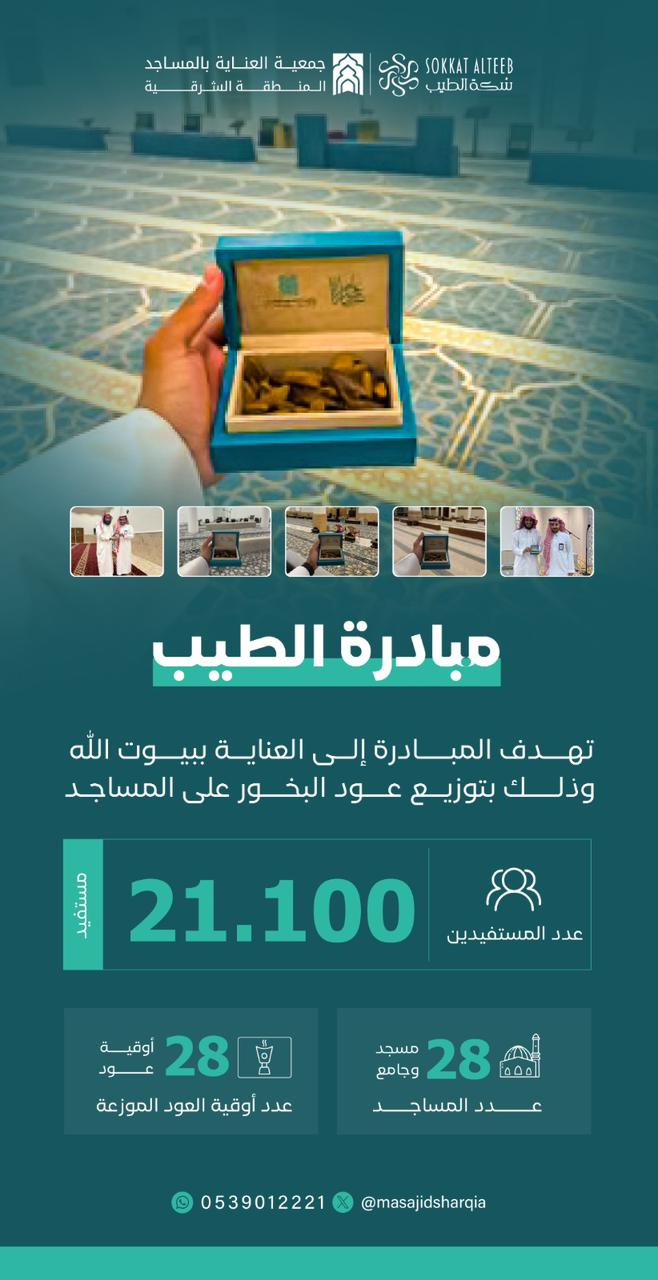 أطلقت جمعية العناية بالمساجد بالمنطقة الشرقية مبادرة نوعية بعنوان الطيب بالتعاون مع  سُكّة الطيب، تهدف إلى نشر عبق الطيب في بيوت الله وإضفاء أجواء روحانية تعبّر عن العناية ببيوت الرحمن.