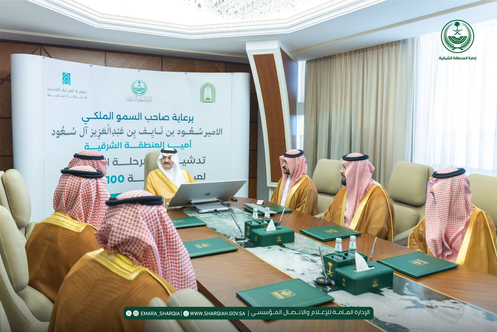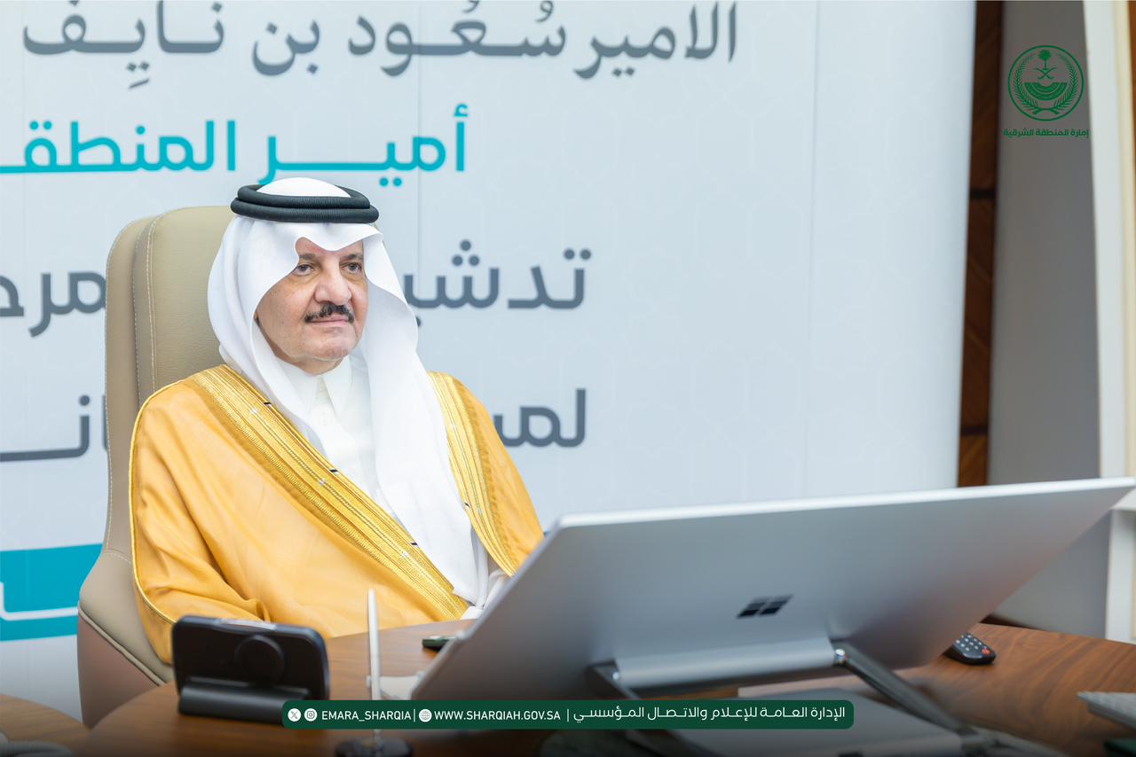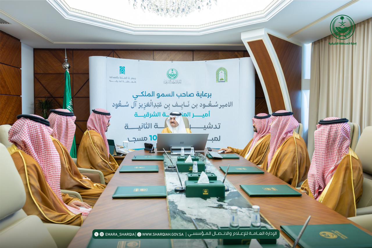 دشّن صاحب السمو الملكي الأمير سعود بن نايف بن عبدالعزيز آل سعود، أمير المنطقة الشرقية، اليوم الأربعاء 22 أبريل 2026م، بمكتب سموّه بمقر الإمارة، المرحلة الثانية من مبادرة صيانة 100 مسجد بمحافظة الخبر، التابعة لجمعية العناية بالمساجد بالمنطقة الشرقية، وذلك بحضور رئيس مجلس الإدارة الأستاذ عبدالرحمن بن سليمان الضلعان، وعدد من أعضاء مجلس الإدارة والإدارة التنفيذية للجمعية .